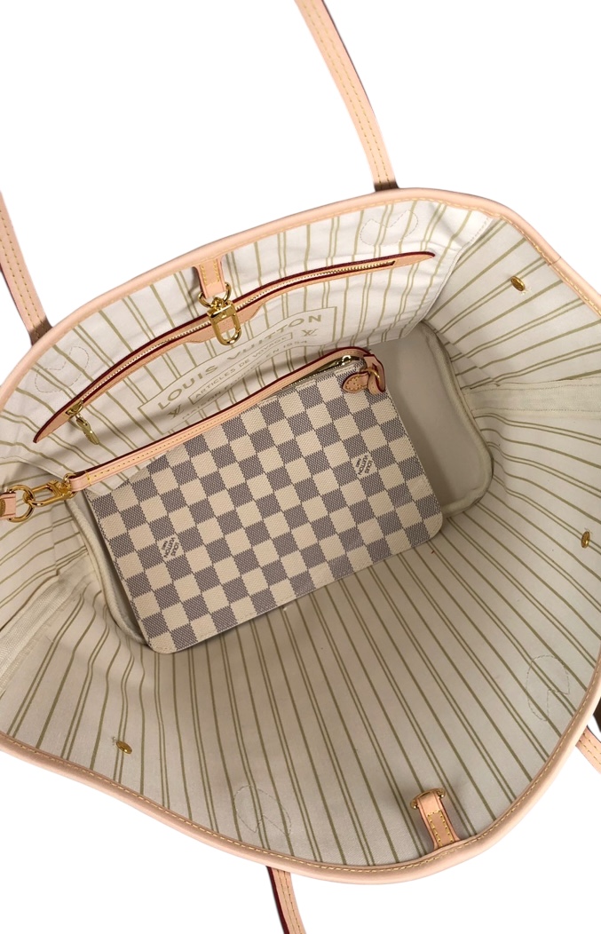 El Neverfull MM es un bolso tote espacioso, versátil y elegante. Está confeccionado en lona Damier Azur con detalles en piel, que con el tiempo desarrolla una pátina única. Tiene cordones laterales ajustables, forro interior textil con rayas, y un gancho para cerrar el bolso parcialmente.