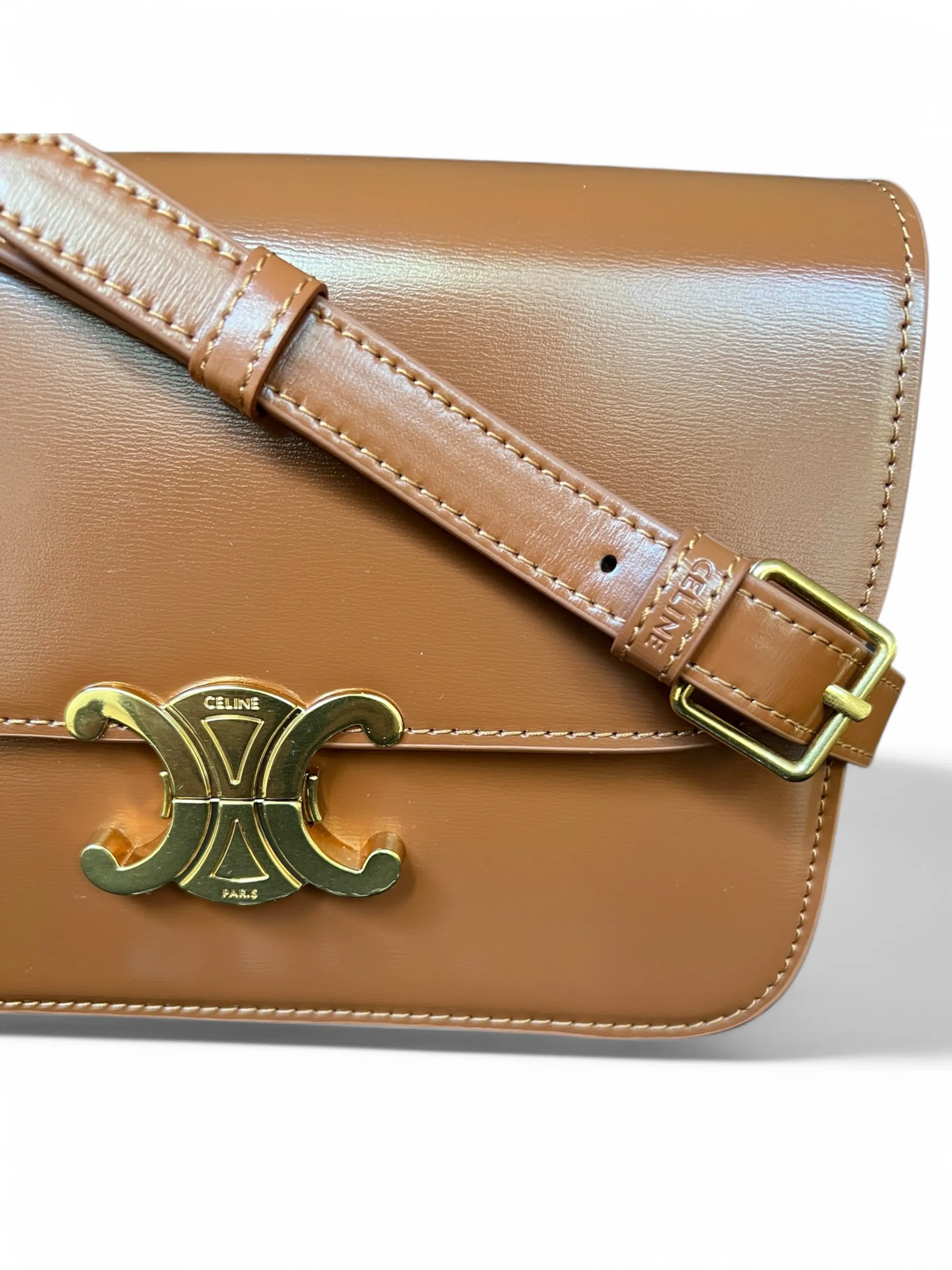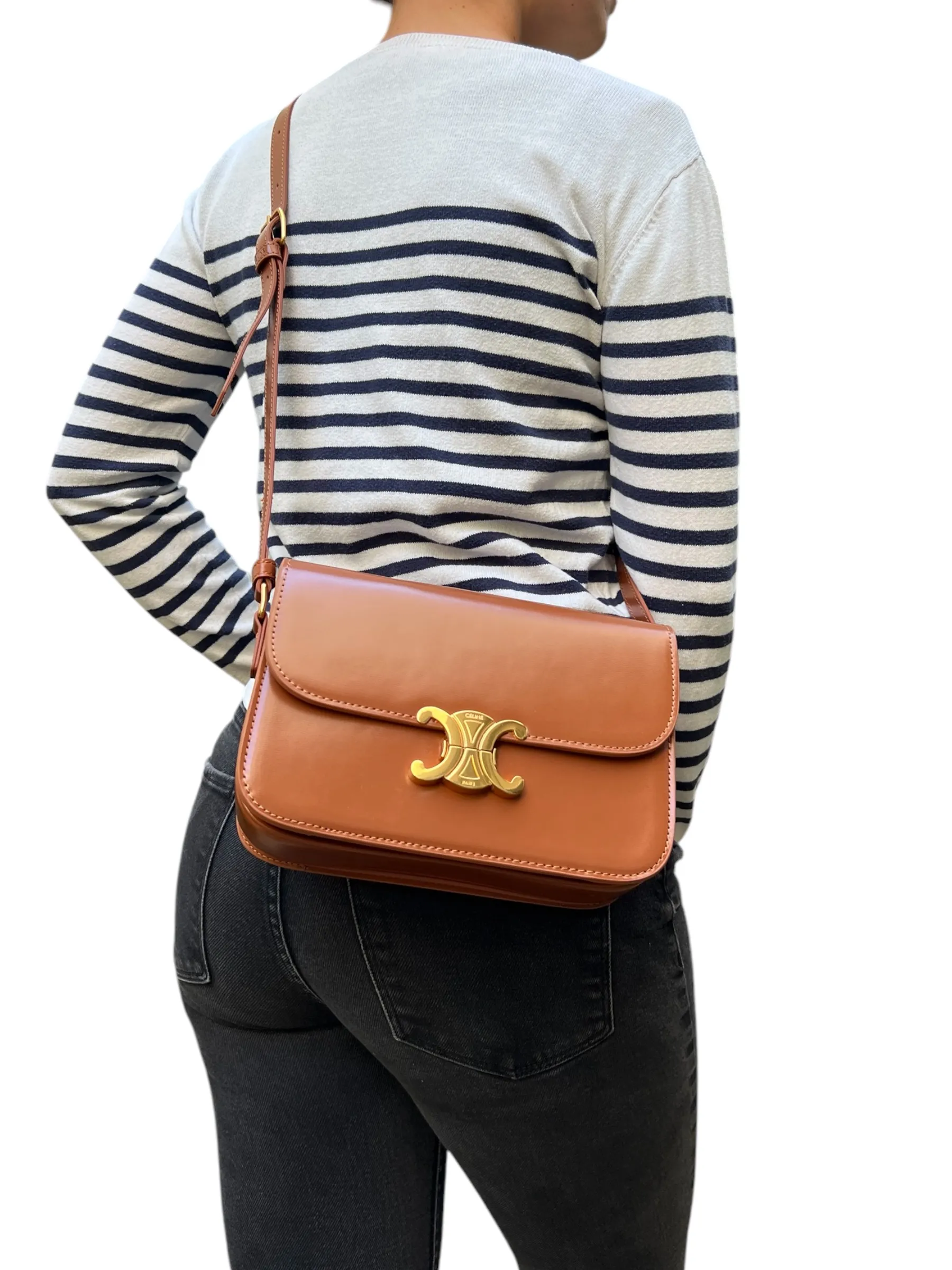 El bolso Triomphe destaca por su diseño minimalista, elegante y atemporal. Está confeccionado en piel lisa de alta calidad y presenta el emblemático cierre metálico Triomphe. Su estructura rígida y líneas depuradas lo convierten en un accesorio sofisticado ideal tanto para el día como para la noche.